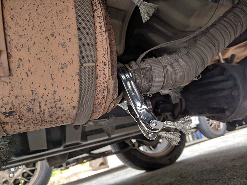 仕事クルマエブリイ1号車・・・洗濯ばさみ型ダブル放電テルテル、エキマニ周辺と排気管にねじ込まれているセンサー部にセットしてみました(写真参照)。